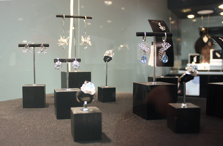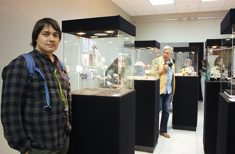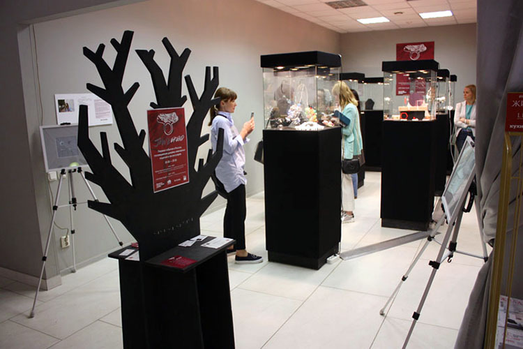 Первая часть выставки украшений прошла на одной из площадок «Недели», в Манеже Кадетского корпуса на Университетской набережной. Экспозиция была оформлена в выдержанном стиле, и демонстрировала марки участников скорее как музейные экспонаты.