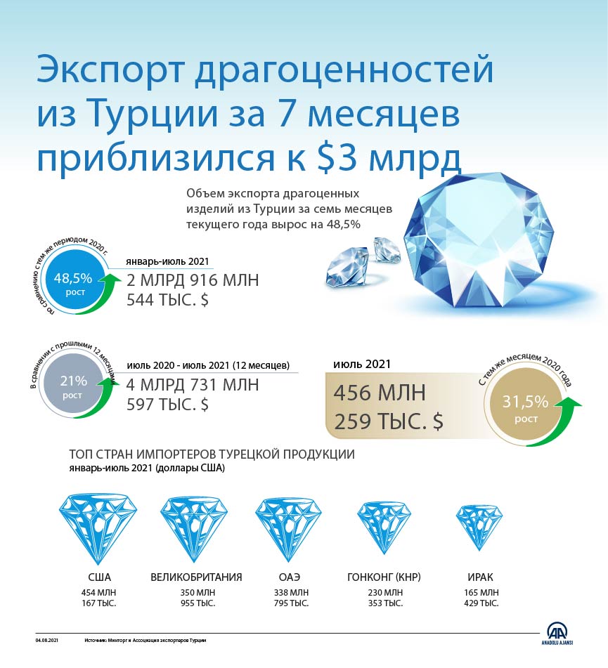 Экспорт драгоценностей из Турции за семь месяцев текущего года вырос на 48,5 процента по сравнению с аналогичным периодом прошлого года - до 2 млрд 916 млн 544 тыс. долларов. Об этом свидетельствуют данные Министерства торговли и Союза экспортеров Турции.