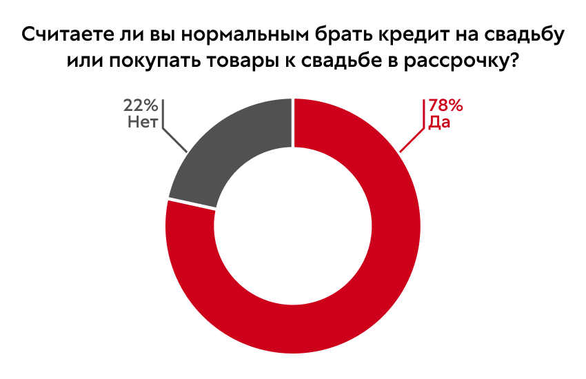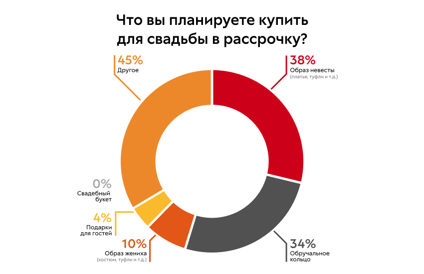 Из интересного: по мнению россиян самые дорогие статьи бюджета на свадьбу – свадебное платье (54%), аренда площадки для торжества (15%), обручальные кольца (15%) и развлечения для гостей (музыканты, ведущие и тд. — 7%).