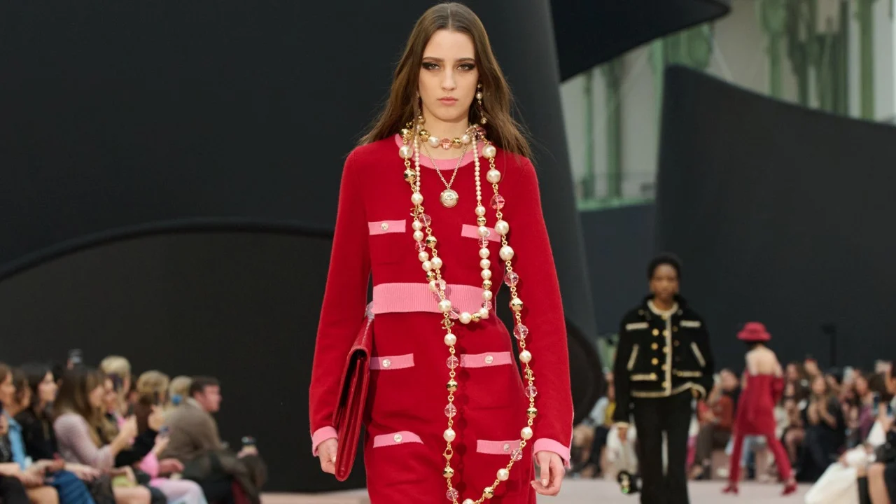 Бертон была не одинока в своем вдохновении. Chanel ассоциируется с жемчугом, но на показе бренда осень/зима 2025 бренд представил красочные длинные трикотажные изделия, перемежаемые очень длинными сотуарами из огромных жемчужин.