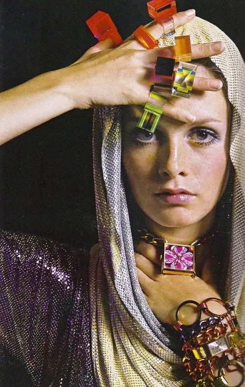Ключевой тренд: Мод-стиль 1960-х годов ассоциируется с графичным минимализмом, геометрическими узорами и использованием ярких пластиковых материалов. Эмаль и акрил прочно вошли в арсенал ювелиров.