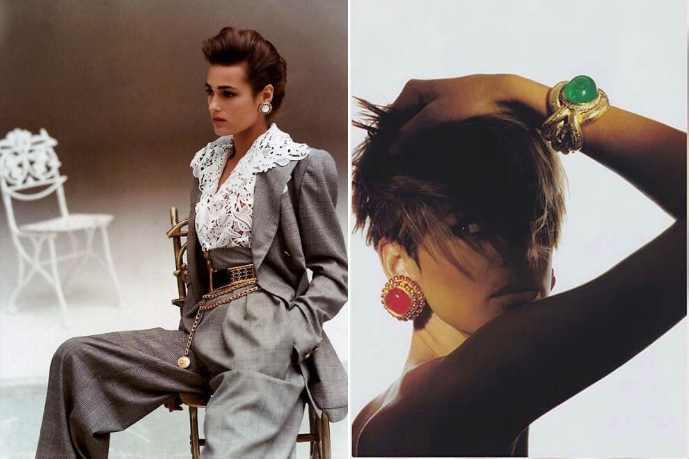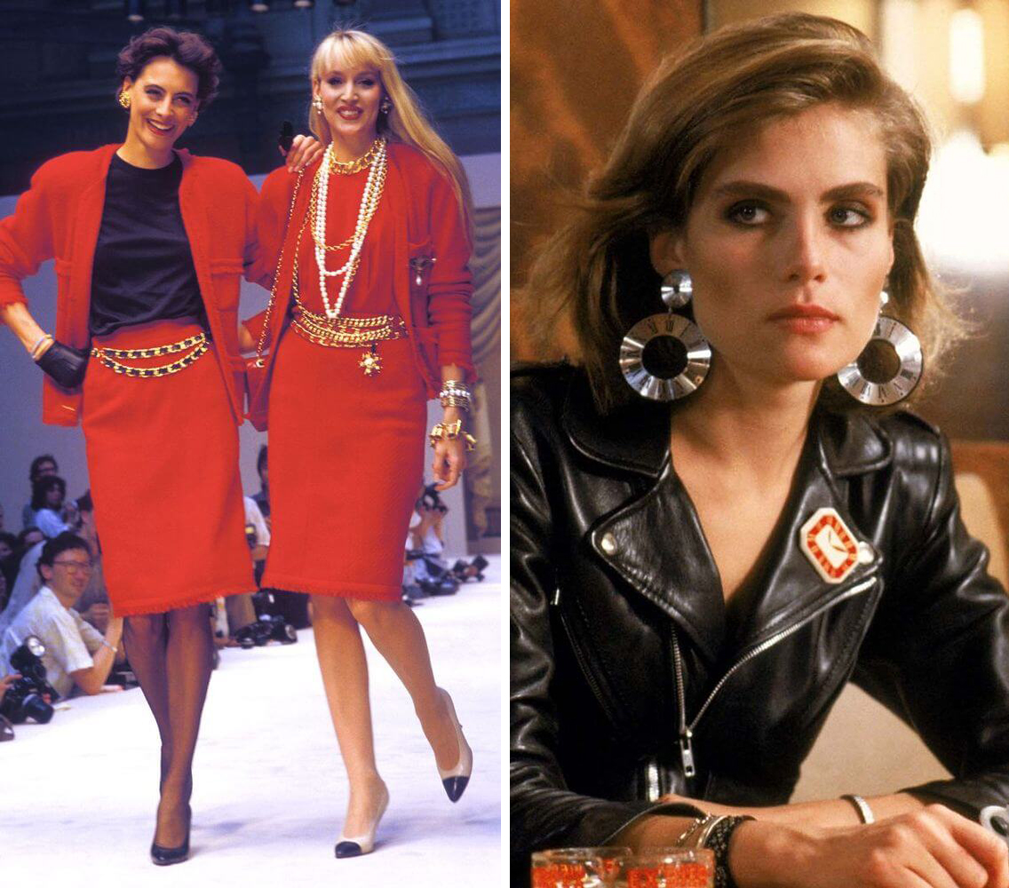 на фото слева: Неделя моды 1980-х годов: Инес де ла Фрессанж и Джерри Холл на подиуме показа Chanel. Справа: Ювелирные украшения 80-х Эммануэль Сенье в сериале Frantic 1988 (здесь и далее в 1980-х гг фото взяты на сайте vinty)