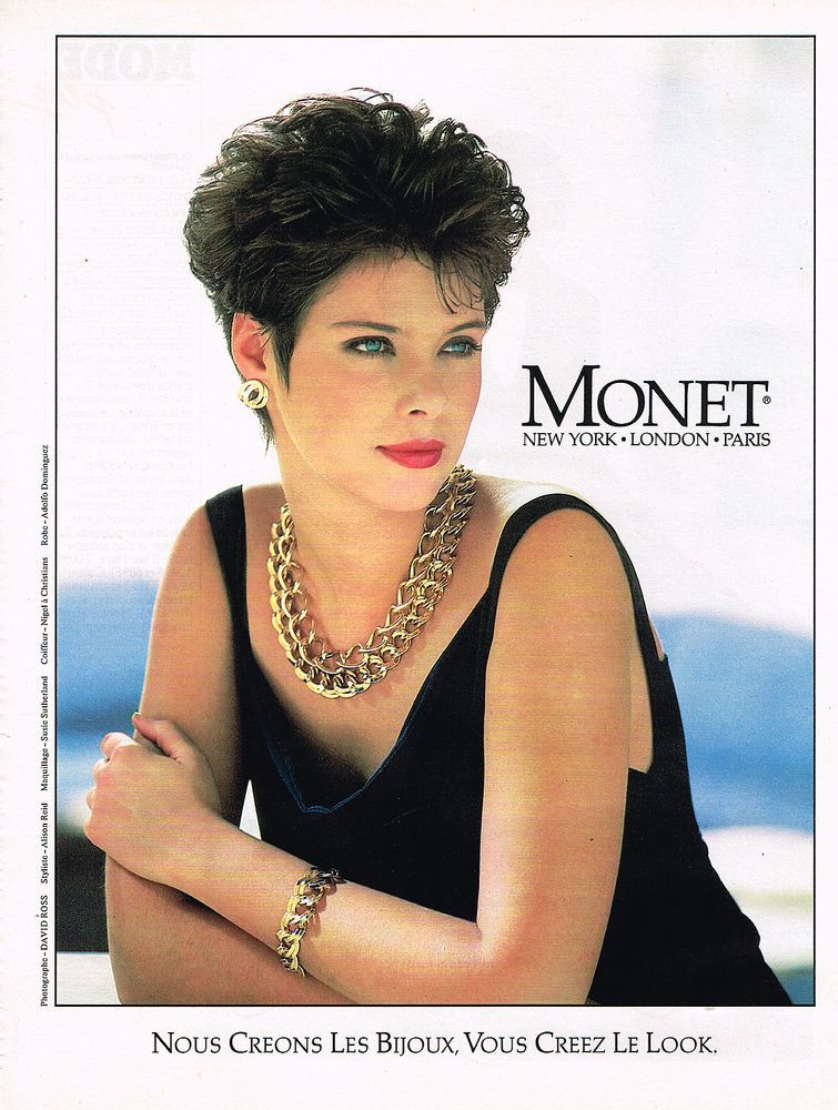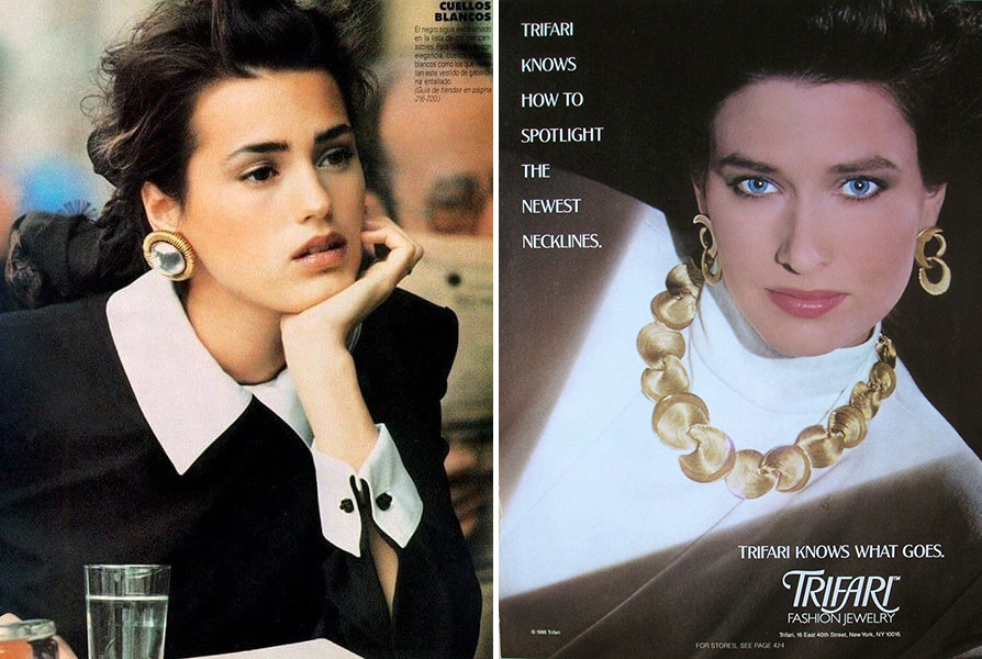 Реклама Trifari, 1985 г.; Крупные серебряные серьги-кольца и массивное платиновое колье-чокер, ELLE US, июнь 1988 г. Фотограф Жиль Бенсимон. Модель Мишель Ибри