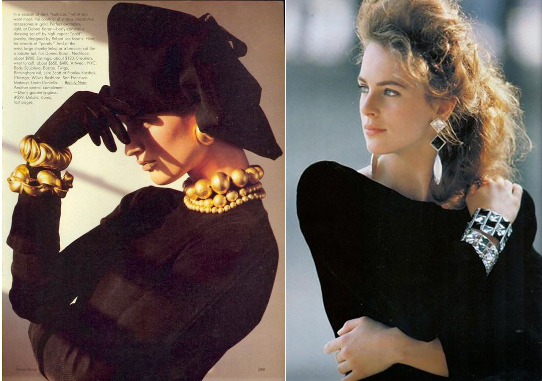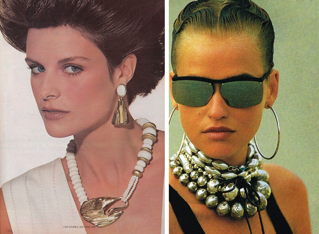 Крупные и смелые золотые ожерелья и браслеты, Vogue US, август 1985 г.; Комплект из серебряных серег и браслета с кристаллами, Vogue UK, октябрь 1987 г.