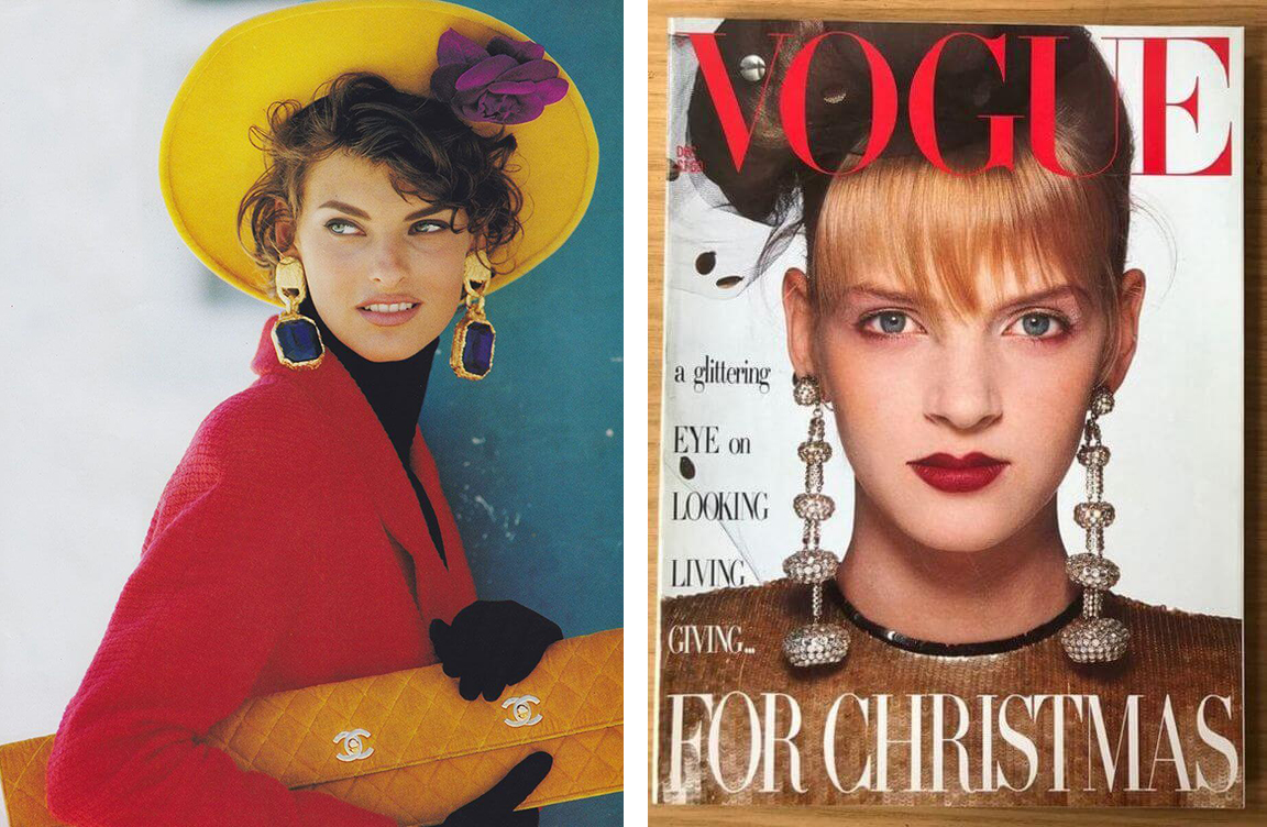 Линда Евангелиста в крупных серьгах с драгоценными камнями, Vogue Us, конец 80-х; Ума Турман в длинных бриллиантовых серьгах, Vogue US, 1985 г.
