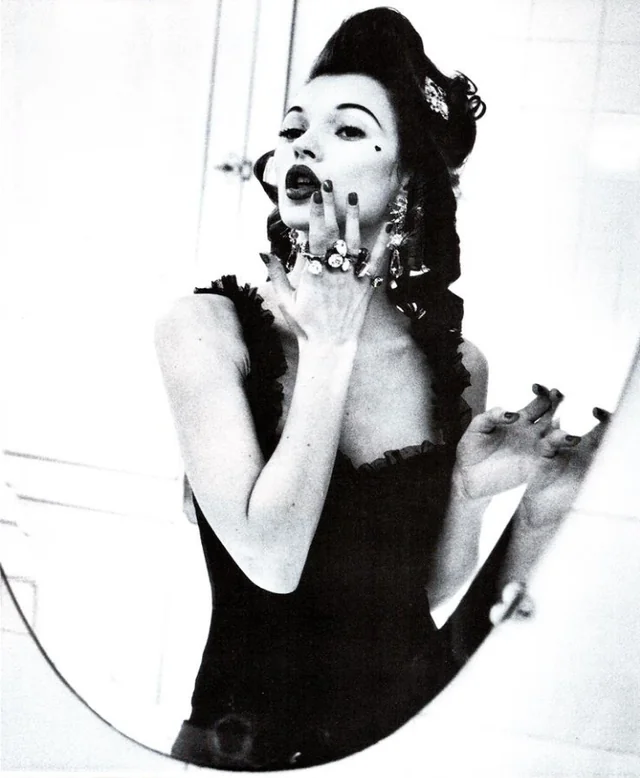 слева на право: Ясмин Ле Бон в деловом костюме с крупными серьгами-дисками и золотыми жемчужинами, Vogue Paris, март 1988 г.; Серьги Dominique Aurientis в Vogue, август 1989 года. Фотограф Ирвинг Пенн