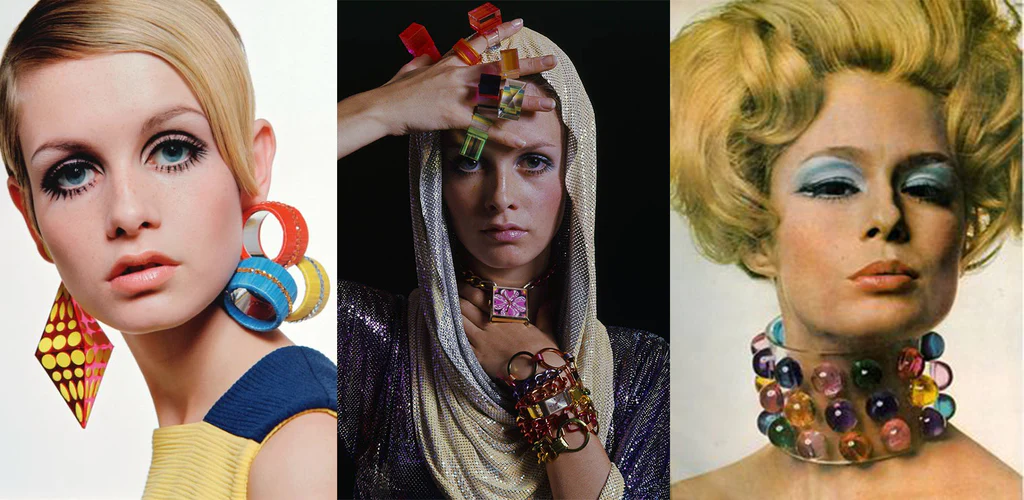 Украшения 1960-х годов отличались смелостью, яркостью и крупными размерами. В них отчетливо прослеживается влияние современного искусства и поп-арта. Использование новых материалов, таких как пластик, свидетельствовало о стремлении к инновациям.