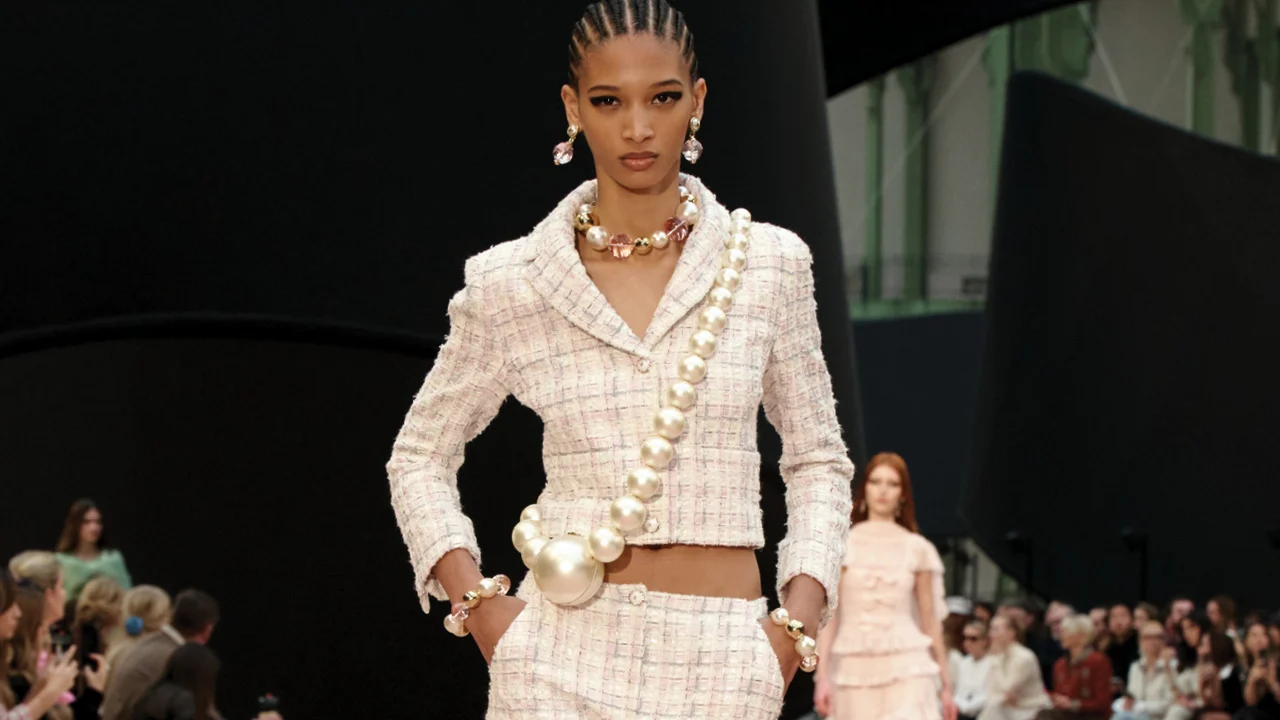 Модель демонстрирует огромные жемчужины в качестве аксессуаров на подиуме Chanel. (Chanel)