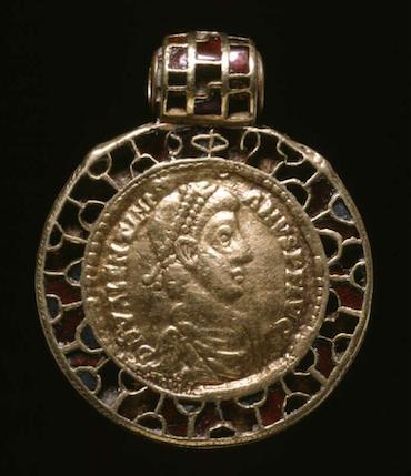 Кулон из золота сгарнатами и солидом Валентиниана II