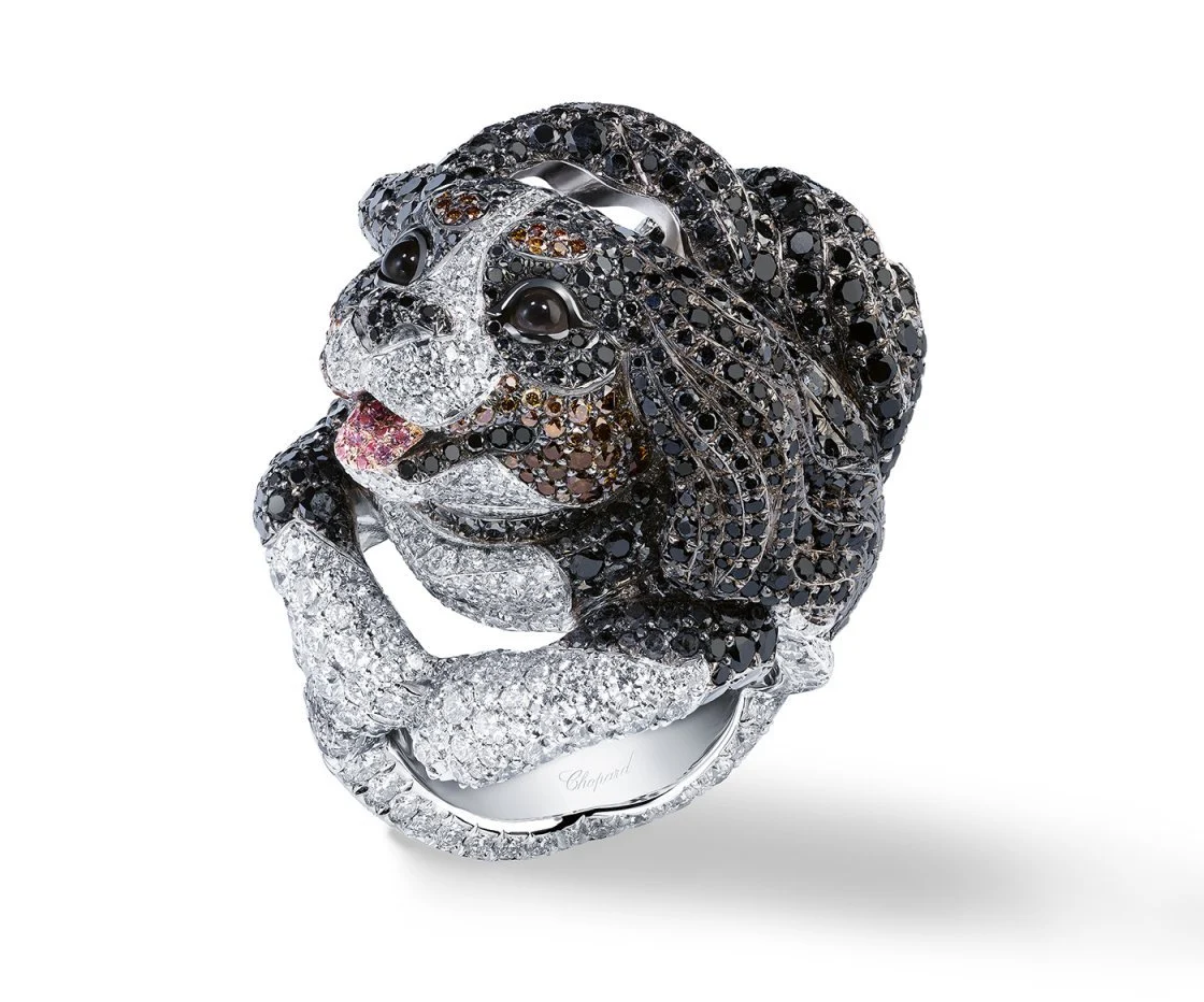 Коллекция, представленная Chopard на Каннском кинофестивале в мае 2025 года, несомненно, самая личная из всех. Ее название? «Вселенная Каролины». В ней Каролина Шойфеле рассказывает о своей любви к цветам и животным, которая уже очевидна в садах, окружающих ее дом на берегу Женевского озера, где она живет со множеством собак. И действительно, кто же появляется среди павлинов, попугаев, панд и бегемотов, как не Байрон, ее кавалер-кинг-чарльз-спаниель, изображенный на кольце с белыми, черными и коньячными бриллиантами? Коллекция рисует проникновенный портрет сопрезидента и художественного директора Chopard: «Каждое ювелирное изделие — это сцена; каждый драгоценный камень рассказывает историю, в которой искусство ювелирного дела отражает как мой личный путь, так и универсальные эмоции».