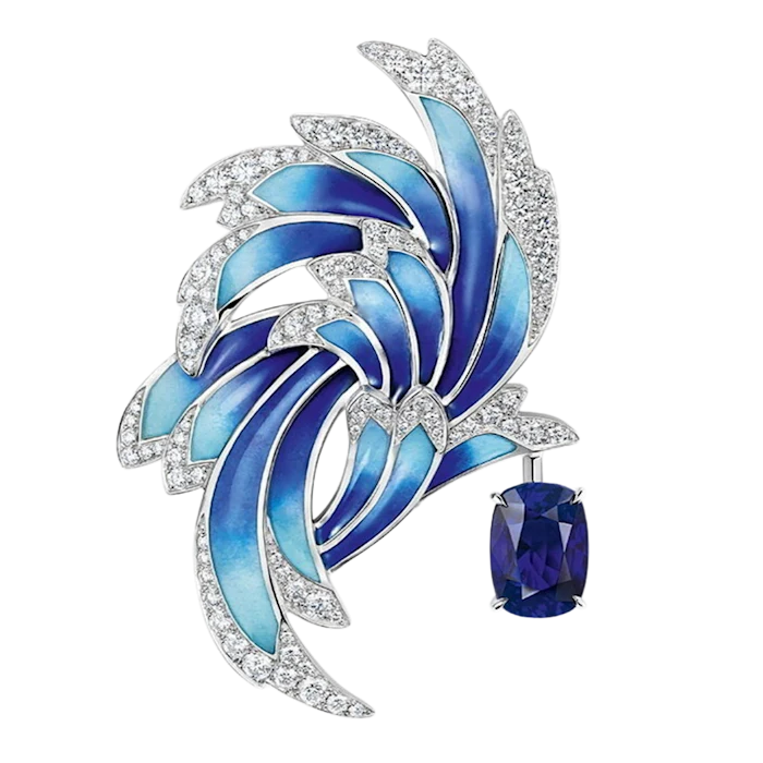 Для изделий из белого золота в своей коллекции бренд использовал технику эмали «гран феу», позволяющую создавать цветовой градиент. Корсини описывает эту технику эмалирования, используемую в циферблатах дорогих часов, как «одно из самых невероятных воплощений ювелирного мастерства». И, по ее словам, она требовала «очень высокого уровня ювелирного искусства». После ручной обработки металла три оттенка синего пигмента (порошок), подобранные в соответствии с сапфирами, смешивались с водой. Каждый из них наносился кистью и смешивался в градиент на крыльях узоров. После каждого слоя изделия обжигались в печи при температуре 750-800 градусов Цельсия. После достижения желаемой глубины цвета эмаль полировалась и наносилось прозрачное покрытие. Эффект градиента был достигнут только после многочисленных экспериментов. «Поскольку это делается вручную, повторить это довольно сложно», — говорит Корсини. Для контроля за нанесением эмали компания привлекла к работе мастера, победителя конкурса Meilleur Ouvrier de France, предназначенного для ремесленников.