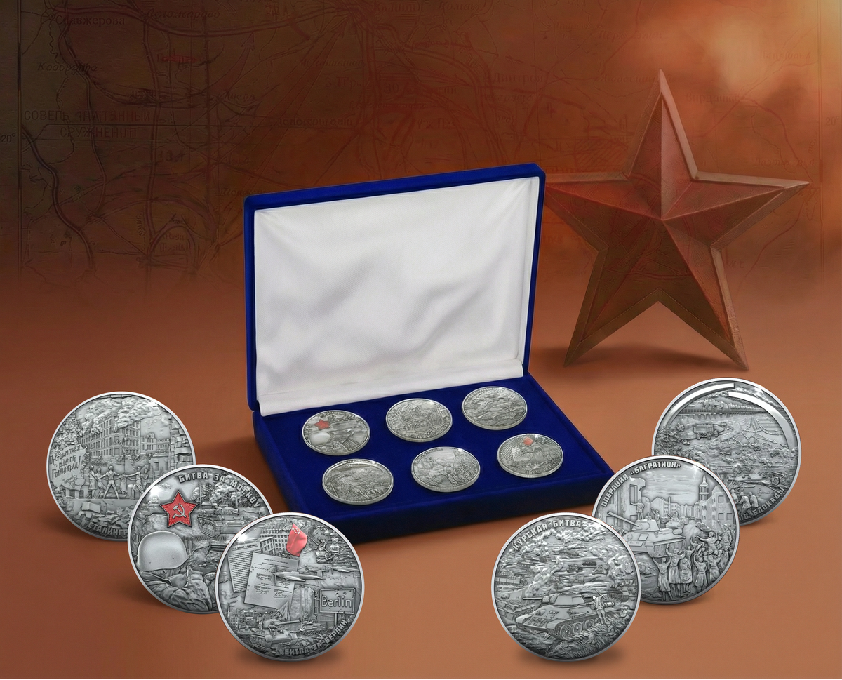 В коллекцию входят памятные монеты, которые посвящены ключевым событиям войны: