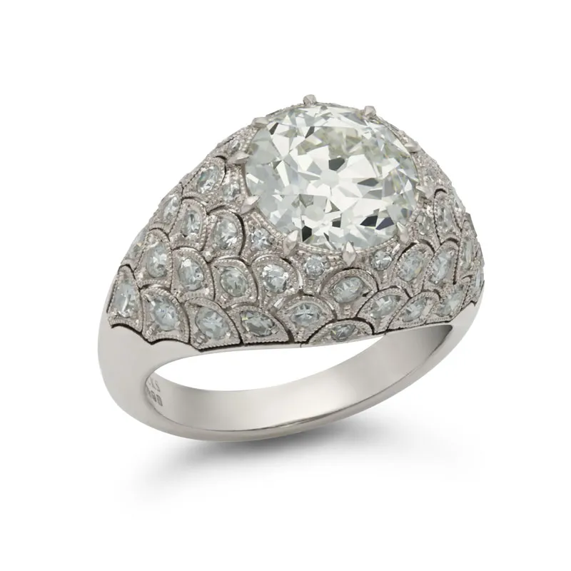 В 1940-х годах ювелиры представили объемные bombe rings (произносится как «бом-бей») с куполообразными силуэтами, инкрустированными бриллиантами, которые отражали скульптурную эстетику той эпохи. Название происходит от французского слова «bombé», означающего «округлый» или «выпуклый», что описывает мягко куполообразный профиль. Эти эффектные изделия отражали военную и послевоенную тягу к смелым, эффектным украшениям, которые выделялись, несмотря на материальные ограничения.
