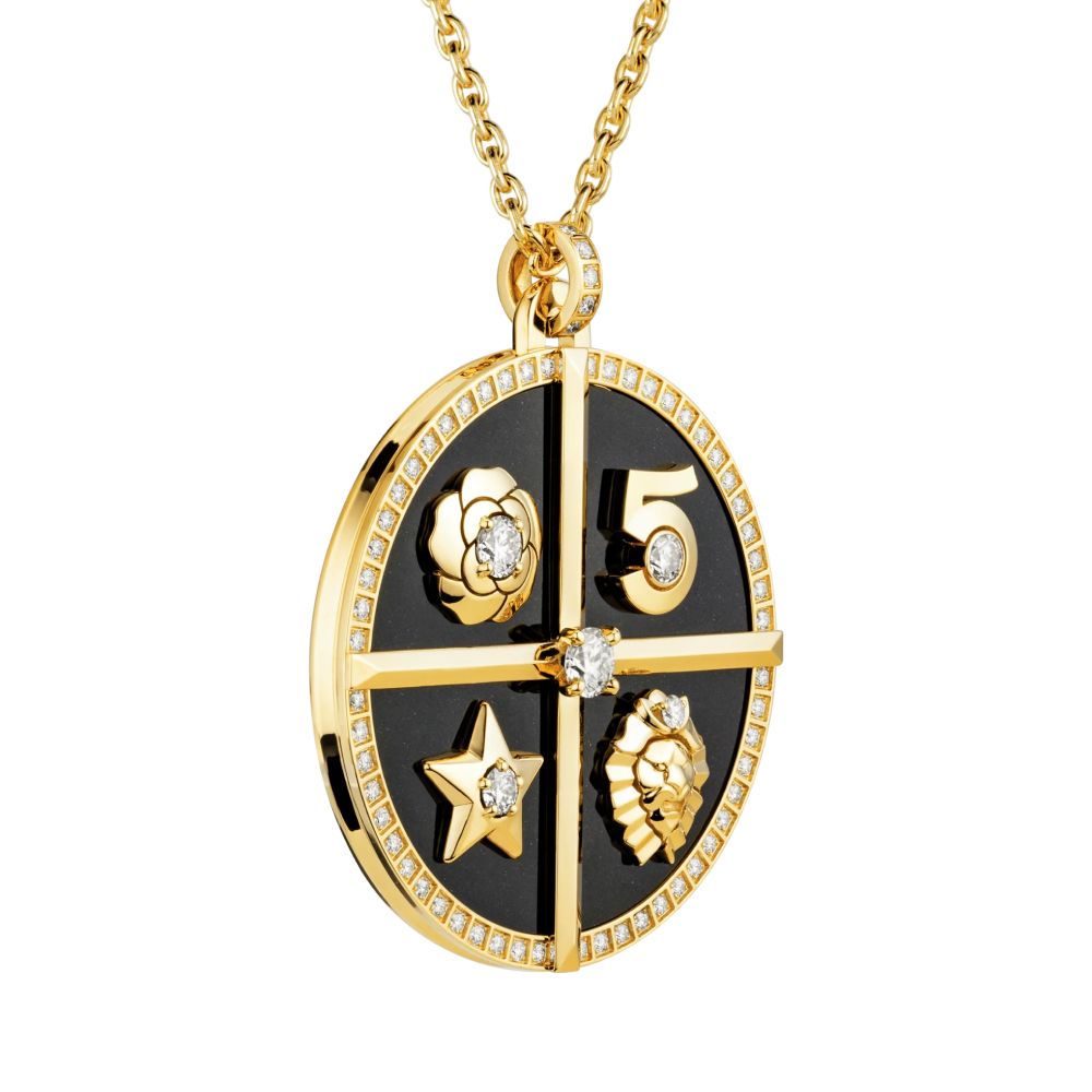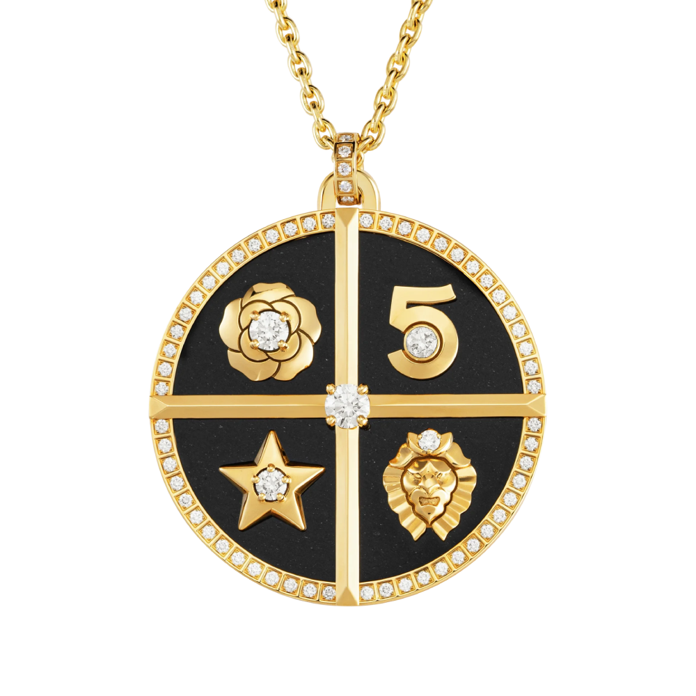 В ожерелье Symbloes одна сторона подвески представляет собой четырехугольную мозаику, где золотые линии очерчивают камелии, цифру 5, кометы и львиные тотемы. В самом центре этой композиции мерцает круглый бриллиант, а черная нефритовая подложка лишь усиливает его сияние. На обратной стороне кулона лазерная гравировка создает трехмерный эффект логотипа, играя светом и тенью, подобно искусному барельефу.