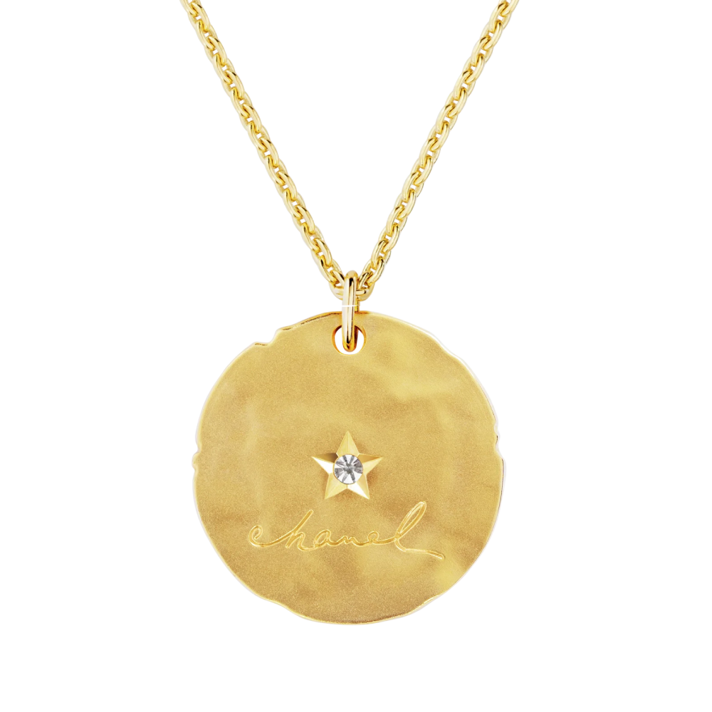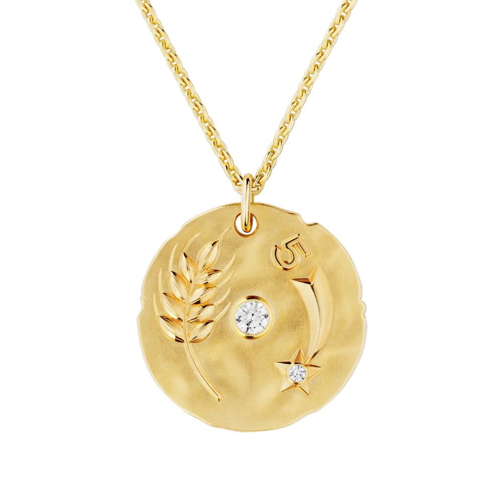 Ожерелье Talismans выковано из золота, создавая трехмерную и волнообразную текстуру. С одной стороны золотой подвески искусно выгравированы колосья пшеницы, цифра 5 и тотем кометы, а в центре сияет элегантный круглый бриллиант. Прямо под звездой можно увидеть факсимиле мадемуазель Шанель – знак подлинности и утонченного вкуса.