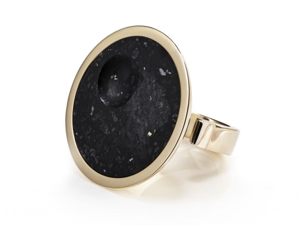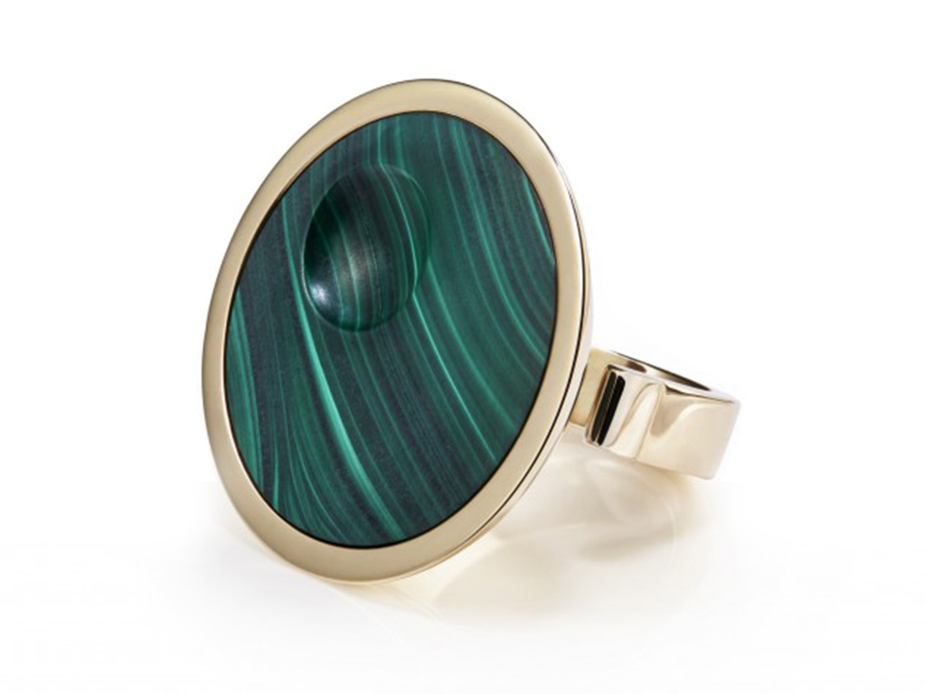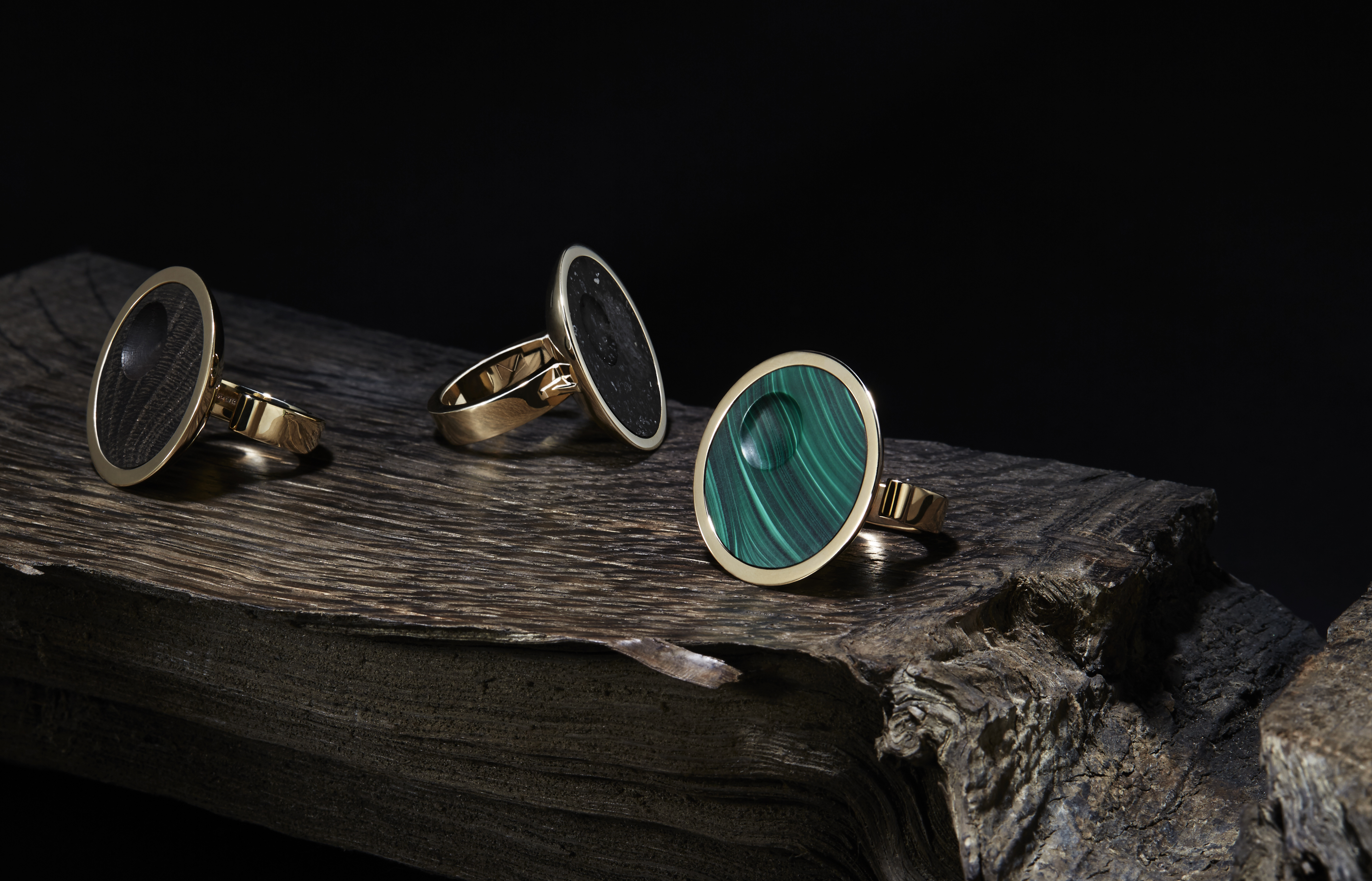 Британский архитектор Салли Макерет экспериментировала с малахитом, тысячелетним дубом и метеоритом в серии скульптурных колец «Оскар».: