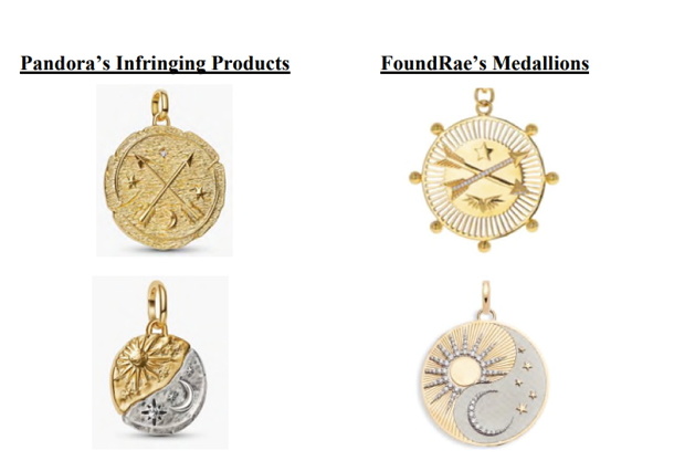Компания FoundRae утверждает, что медальоны Pandora настолько похожи на ее собственные по внешнему виду, тактильным ощущениям и маркетингу, что ей поступают запросы от клиентов, указывающих на это сходство.