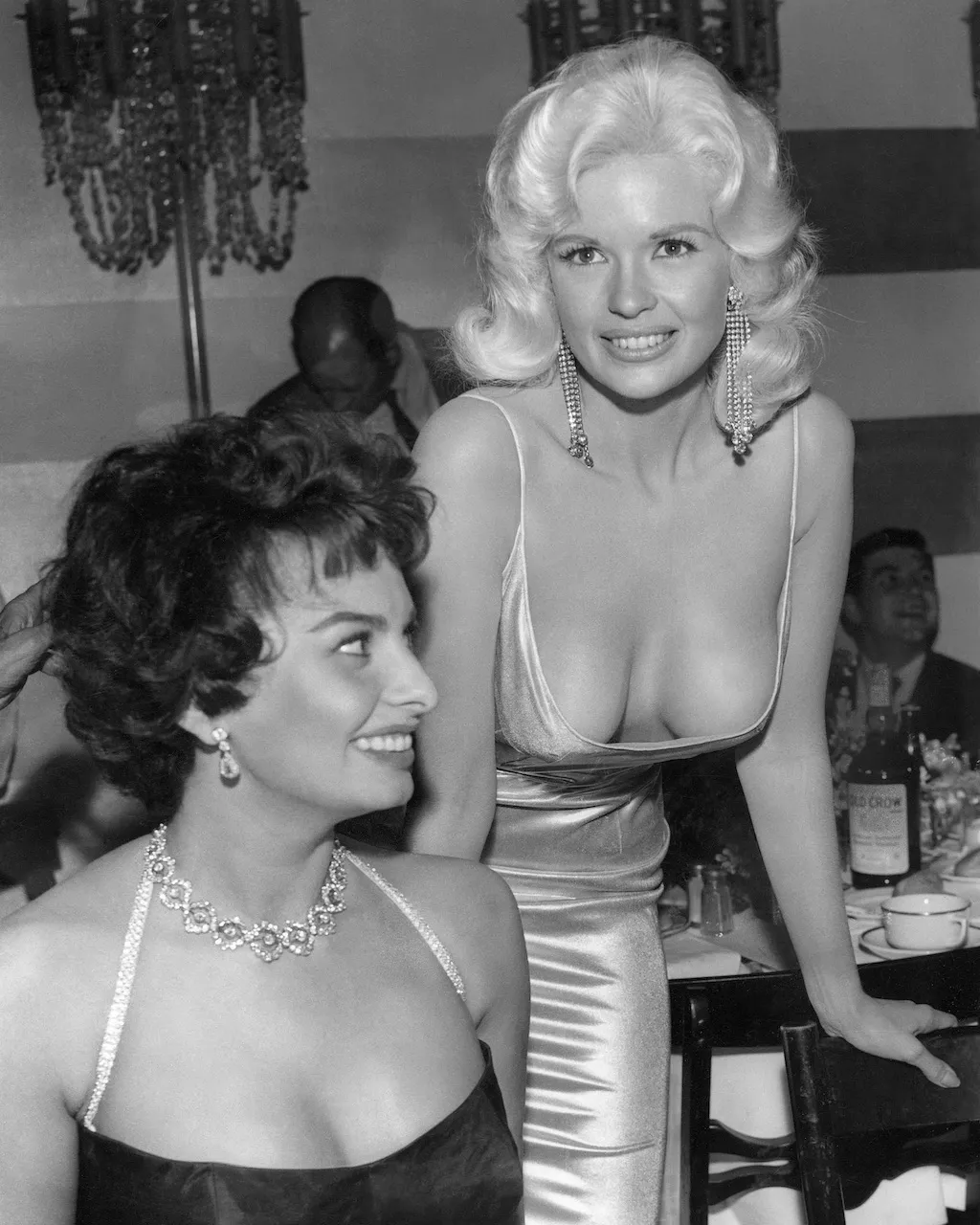 Один из самых знаковых образов старого Голливуда, многие считают фотографии с этого вечера первым задокументированным случаем косого взгляда. Софи Лорен и Джейн Мэнсфилд посетили стильный вечер в Romanoff’s в Беверли-Хиллз. Вечеринка была организована в честь официального вступления Лорен в ряды Голливуда после оглушительного успеха в Европе. В течение всего вечера Лорен поглядывала на обнажённое декольте Мэнсфилд.
