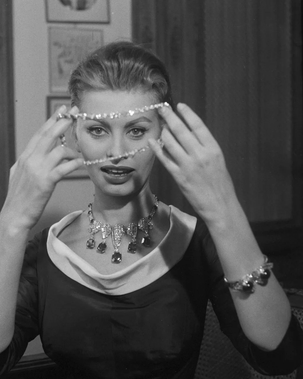 В марте 1959 года, рекламируя фильм «Такой тип женщины», Софи Лорен предалась блистательной съёмке в парижском бутике Cartier. Она примерила некоторые из самых экстравагантных бриллиантовых творений дома, включая незабываемое колье из пяти бриллиантовых панелей с изумрудными каплями и браслет в тон. На одной из фотографий, сделанных в тот день, Лорен игриво держит бриллиантовое колье, и её элегантность могла соперничать разве что с самими украшениями.