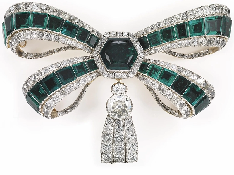 «Украшение для лифа»: бант из изумрудов и бриллиантов. (Предоставлено Королевским музеем сокровищ)