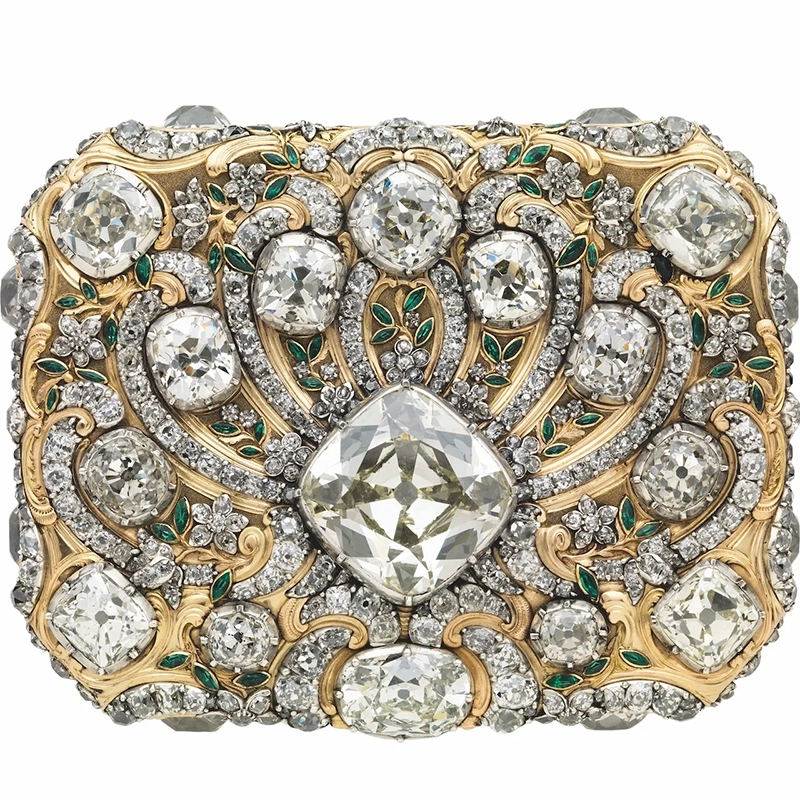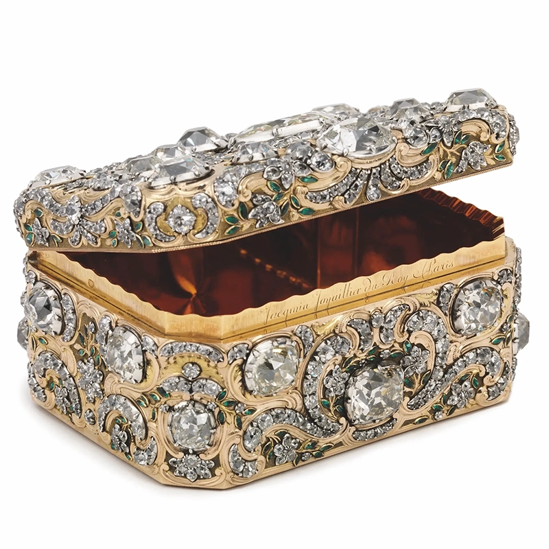 Хотя этот предмет также не входит в состав официальных португальских королевских драгоценностей, одним из самых примечательных экспонатов коллекции Музея королевских сокровищ является роскошная табакерка с бриллиантами, изготовленная по заказу короля Жозе I. Созданная Пьером Андре Жакменом, главным ювелиром короля Франции Людовика XV, эта шкатулка представляет собой вершину французского ювелирного искусства XVIII века — эпохи, когда дипломатические подарки и личные предметы роскоши часто были более изысканными, чем официальные регалии.