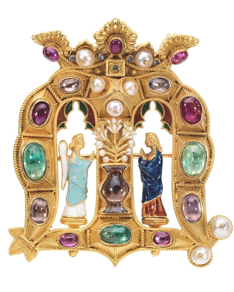 «Драгоценность основателя», выполненная из желтого золота с изумрудами, рубинами, сапфирами и жемчугом, датирована 1862 годом. Она была подарена жителями Неаполя Марии Пиа Савойской. (Предоставлено Королевским музеем сокровищ)