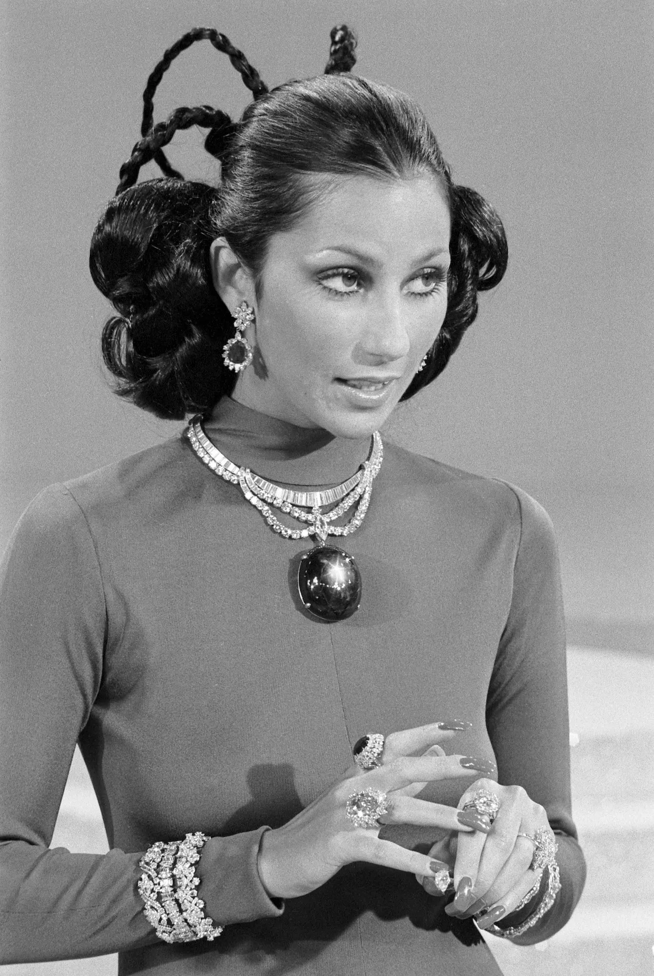 «Комедийное шоу Сонни и Шер», Шер в украшениях на сумму более миллиона долларов и с сапфиром «Черная звезда Квинсленда» на телеканале CBS, 1971 год. (Фото CBS через Getty Images)