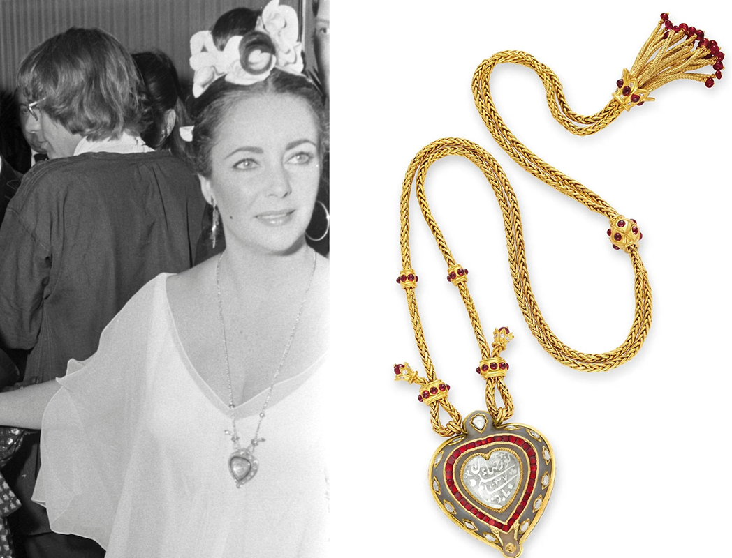 Элизабет Тейлор на вечеринке во время празднования 40-летия в Будапеште, Венгрия, 26-27 февраля 1972 года. (Getty Images); Кулон «Тадж-Махал» от Cartier в индийском стиле: бриллианты и нефрит на рубиновой и золотой цепочке. (Предоставлено аукционным домом Christie's)