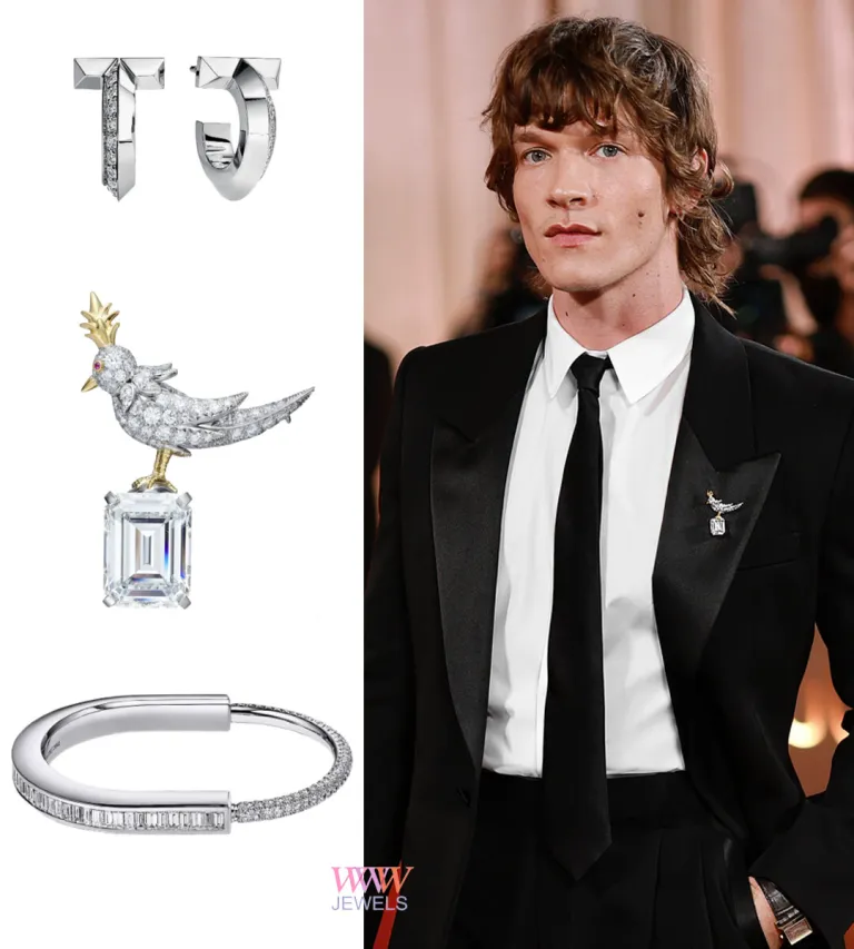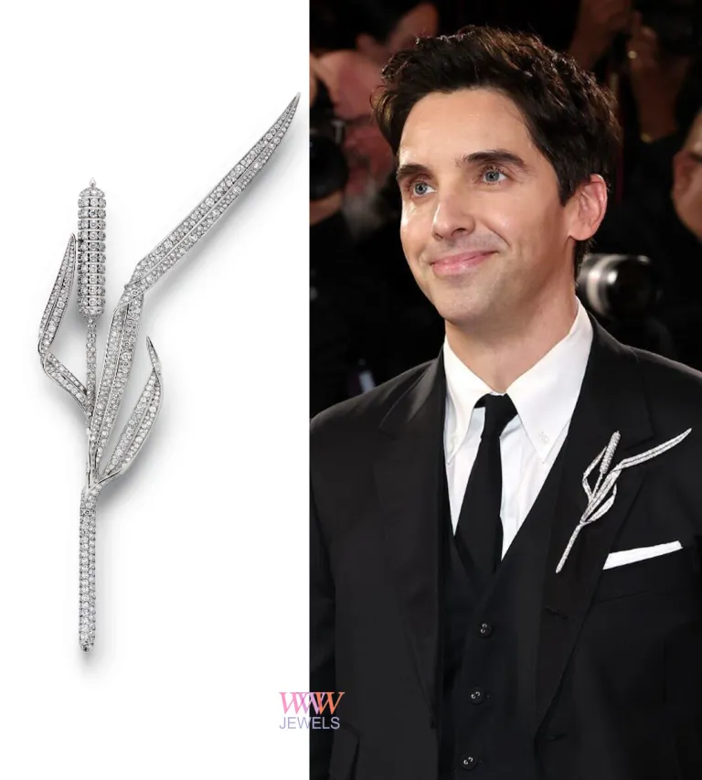 КОННОР СТОРРИ дополнил свой образ на красной дорожке браслетом Tiffany Lock и серьгами T1 , но настоящим намеком для преданных поклонников «Огненного соперничества » стала брошь Tiffany Bird on a Rock , прикрепленная к его лацкану и украшенная 13-каратным бриллиантом изумрудной огранки — тонкий намек на печально известную сцену с гагарой из фильма.