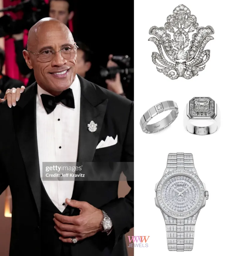 Дуэйн "Скала" Джонсонcон: На церемонии вручения премии «Золотой глобус» "Скала" продемонстрировал все украшения Chopard: кольцо на мизинце, брошь и 29-каратное бриллиантовое кольцо под манжетой на часах, настолько редких, что их существует всего 8 экземпляров, и он носит одни из них.