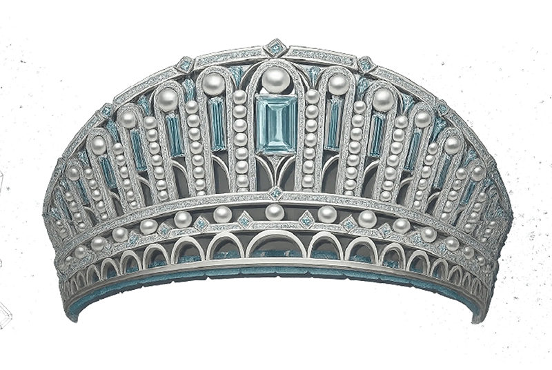 Небесные аквамарины передают чистоту намерений, а белый жемчуг – гармонию и взаимопонимание. Эта корона символизирует восход, момент обретения личной силы.