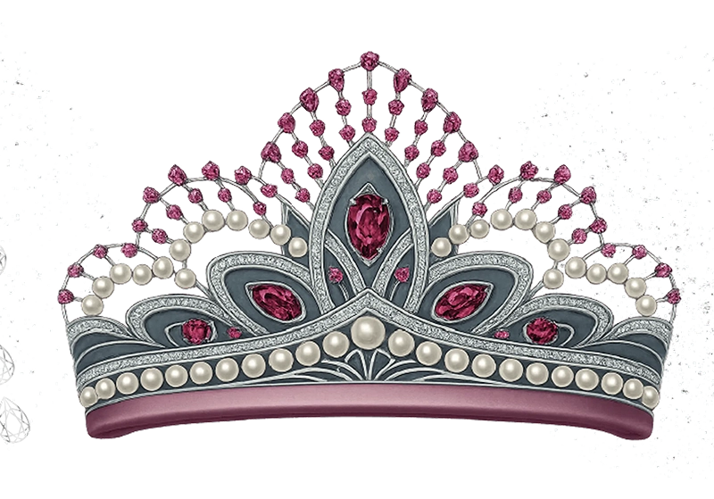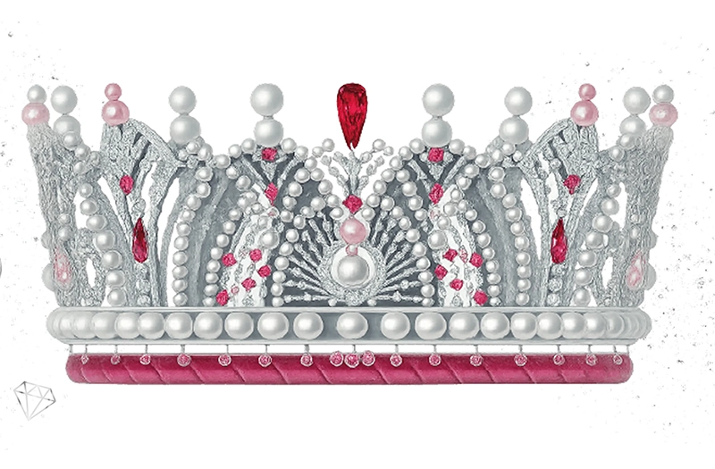 Изящная композиция из турмалинов, рубеллитов и розовых сапфиров напоминает о символике цветения в разных культурах. Белый жемчуг здесь также подчеркивает гармонию и взаимное уважение, а сама корона предвещает будущее величие нового поколения.