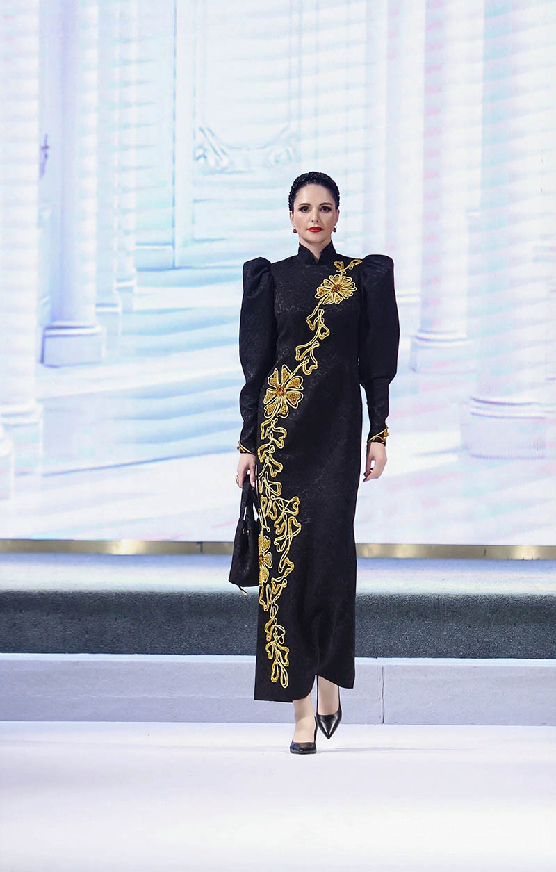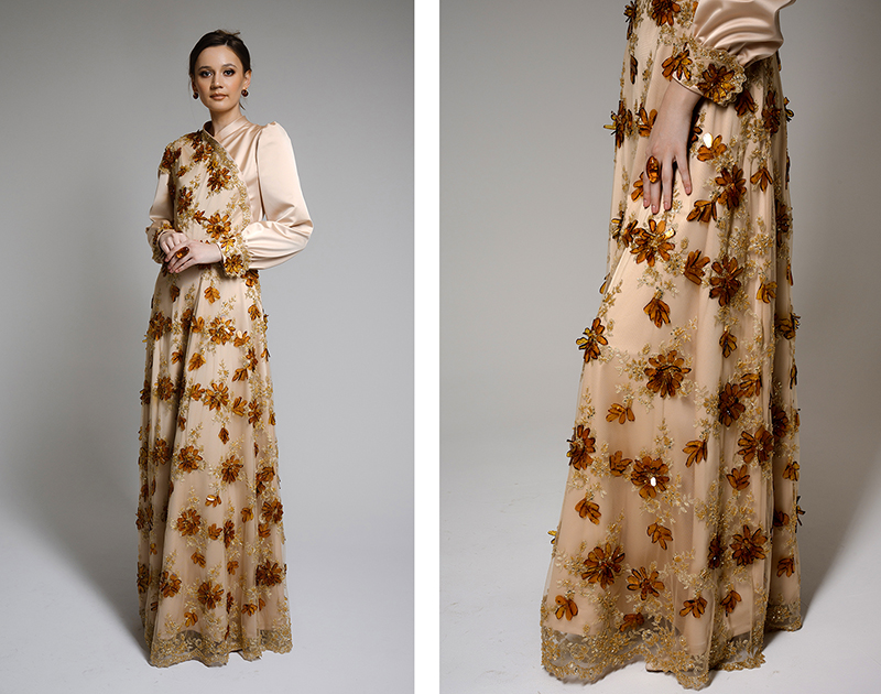 Центральным элементом стало уникальное вечернее платье, для создания которого потребовалось 1300 янтарных деталей. Все они закреплены на ткани вручную, работа заняла более ста часов.