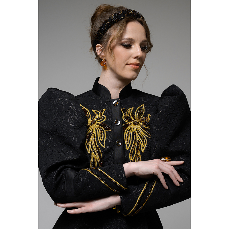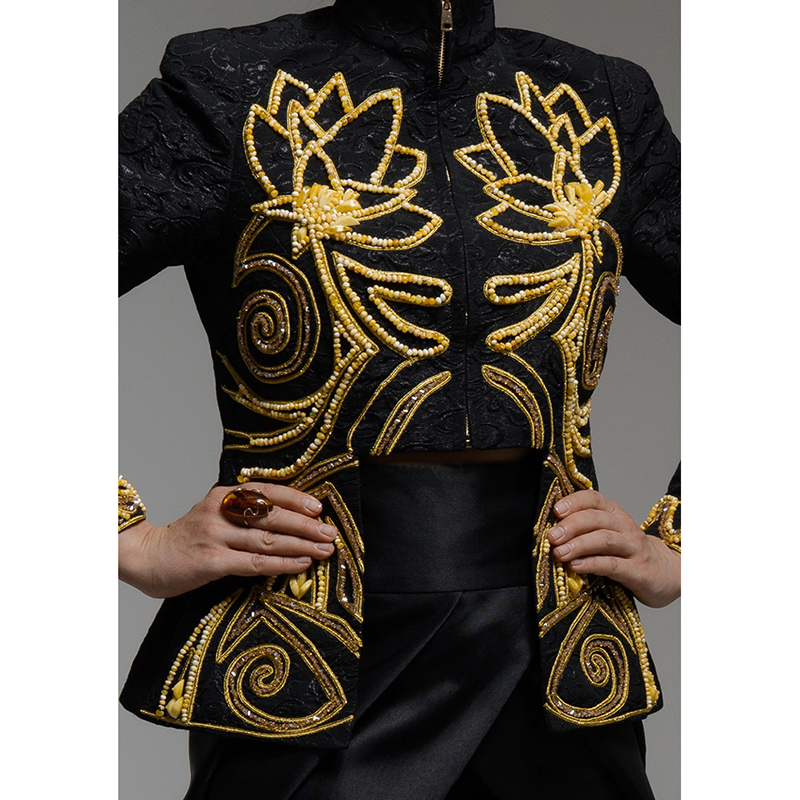 Новая линия включает 15 комплектов. Мастера использовали около трех килограммов солнечного камня, вручную создавая акценты на воротниках, манжетах и лацканах. Из янтаря выполнены пуговицы, а также съемные элементы: пояса и головные уборы.