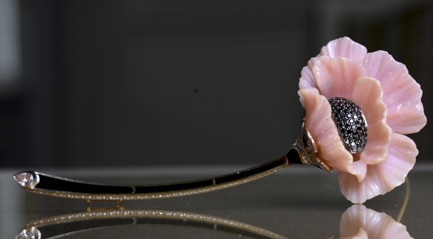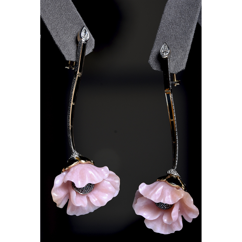 Серьги, брошь «Маки». Золото, черные и белые бриллианты, горячая эмаль, резной розовый опал