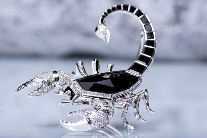 Брошь «Скорпион». Белое золото, бриллианты, черный агат