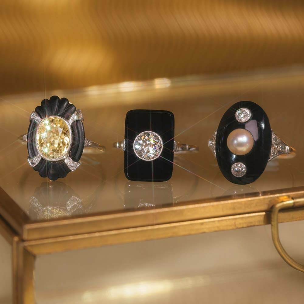 Три кольца из оникса с (слева направо) желтым сапфиром, бриллиантом старой европейской огранки и натуральной жемчужиной, около 1920–1930 гг.
