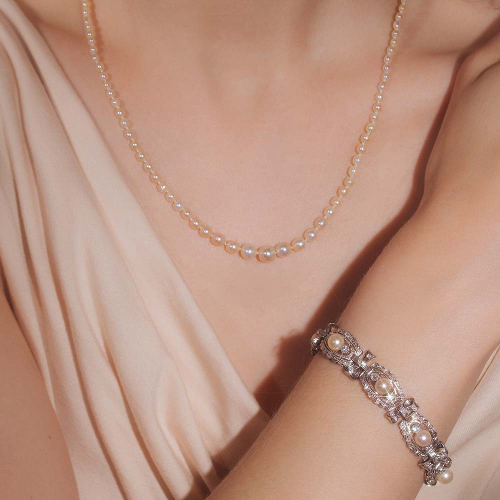 Жемчужное ожерелье в стиле ар-деко и браслет с бриллиантами и культивированным жемчугом, 1920-е и 1940-е годы соответственно.