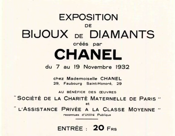 Затем Габриэль Шанель доверили владение коллекцией белых и жёлтых бриллиантов, из которых она должна была составить «Bijoux de diamants» – коллекцию высокого ювелирного искусства, состоящую примерно из 50 изделий. Кутюрье выставляла её в течение 15 дней в своём особняке на улице Фобур-Сент-Оноре. Хотя до наших дней не сохранилось ни гуашей, ни записей о продажах этой коллекции, статьи в прессе того времени свидетельствуют об энтузиазме, вызванном выставкой. Было обнаружено не менее 450 публикаций, а также видеорепортажей, предназначенных в то время для политических событий. Это свидетельствует о масштабе события.