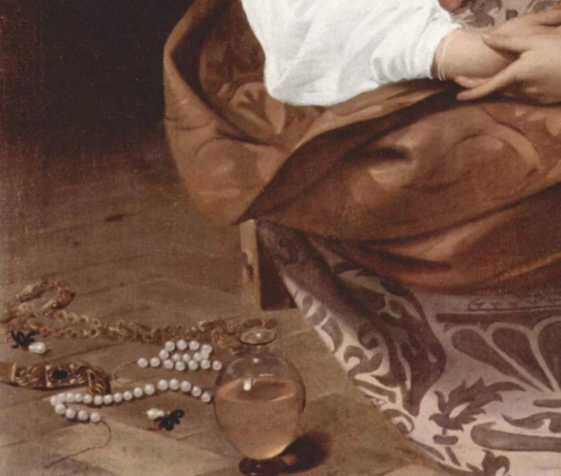 Переходя к эпохе барокко, мы сталкиваемся с драматичным использованием ювелирных изделий в творчестве Караваджо. В «Кающейся Магдалине» украшения отброшены в сторону, символизируя отказ Магдалины от распутной жизни.