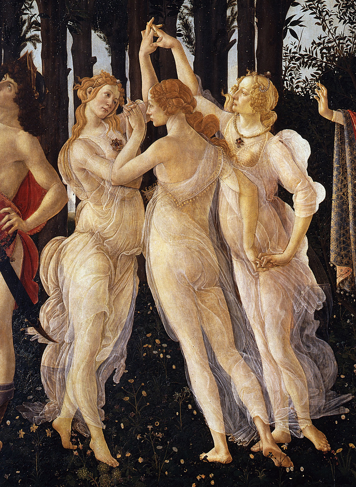 Три грации олицетворяют женские добродетели: целомудрие, красоту и любовь . В классическом искусстве их традиционно изображали обнажёнными, но Боттичелли представил зрителям их в прозрачных белых платьях, украшенных изящным жемчужным головным убором, символизирующим чистоту и красоту. Тонкое прикосновение природы вплетено в подвески в форме цветов – символ весны и роста.