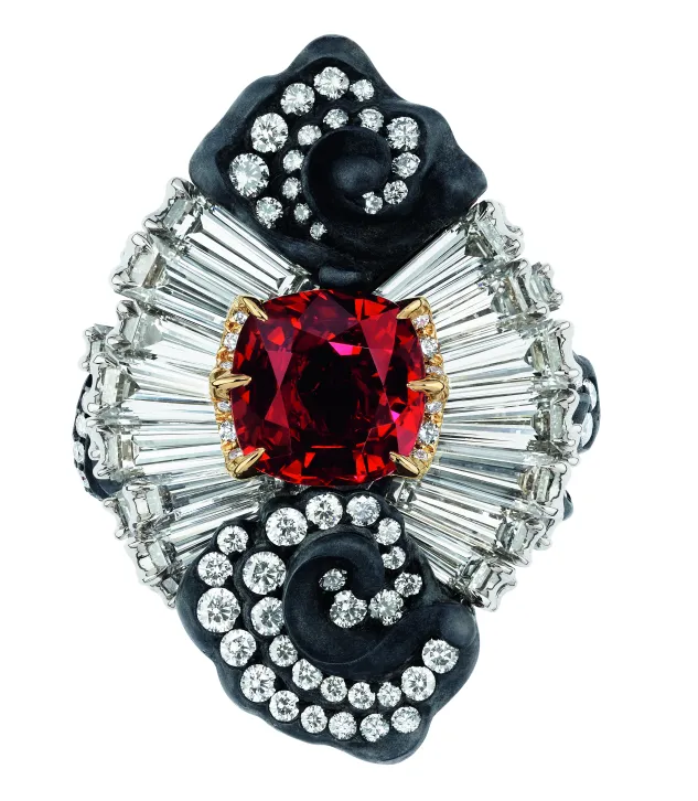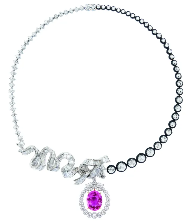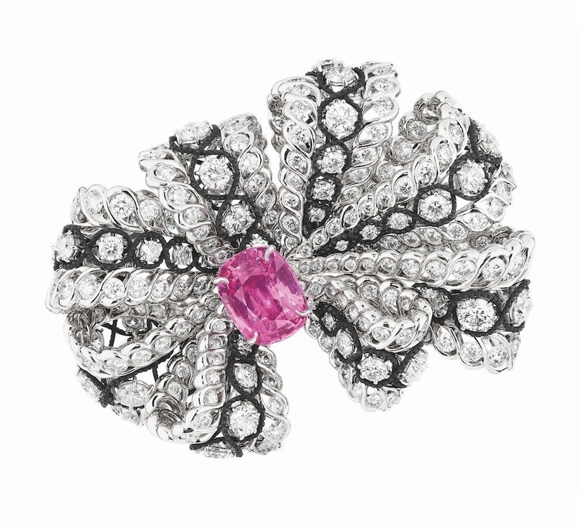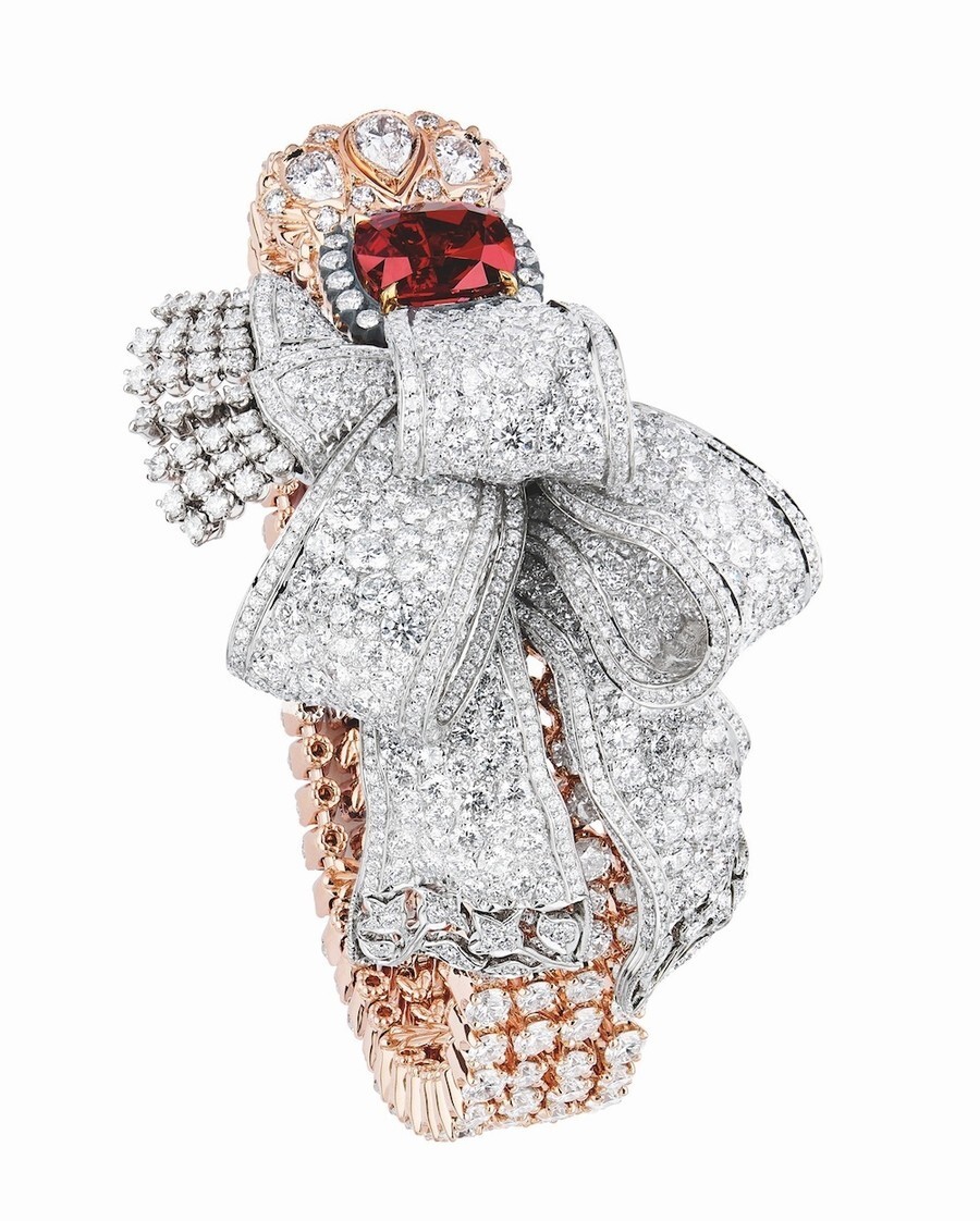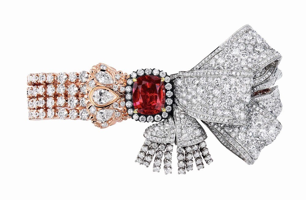 Все это присутствует в графическом дизайне ювелирных изделий, драгоценные камни которых отражают теплые лучи (желтые бриллианты), цвета королевской власти (сапфиры и рубины) и нежные тона гобеленов будуаров (розовые сапфиры), окруженные чистым великолепием белых бриллиантов.