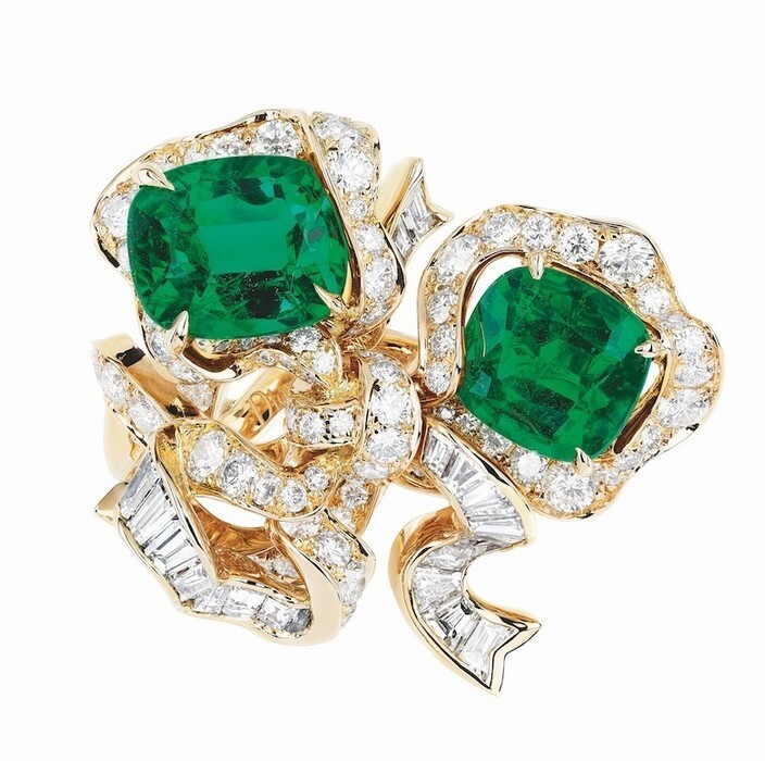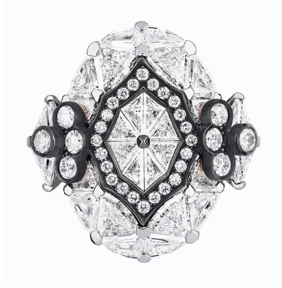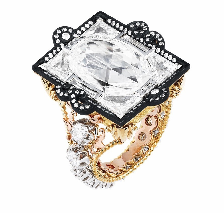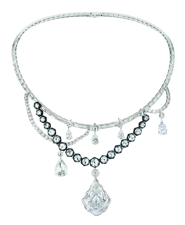 Алмазы огранки «роза» и бриллианты огранки «бриолет» контрастируют с более современными бриллиантами огранки «багет» и белым золотом, а настоящие гирлянды в стиле рококо оплетают калиброванные, геометрические бриллиантовые ожерелья.