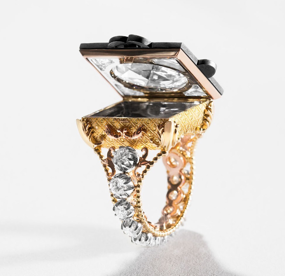 Оно отличается прямоугольной формой, повторяющей резьбу на золотой раме в зале, а в самом сердце кольца расположен алмаз огранки «роза», олицетворяющий чистое зеркальное отражение. Кольцо напоминает шкатулку с сокровищами, бережно хранящую ценности, где сквозь откидывающуюся крышку проглядывает задняя грань алмаза огранки «роза». Эта конструкция гениально передаёт атмосферу дворцового пространства, скрытого за зеркальной поверхностью.