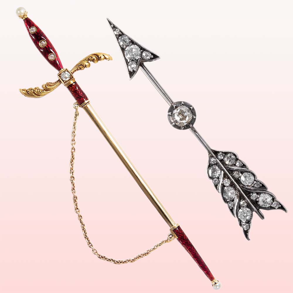 Викторианская страсть к скрытым посланиям нашла изысканное воплощение в ювелирных изделиях. Броши в форме стрел, отсылающие к золотым стрелам Купидона, призваны были разжечь в получателе неистовую страсть – социально приемлемый и в то же время кокетливый аксессуар, особенно если его поместить над сердцем в качестве украшения для корсажа.