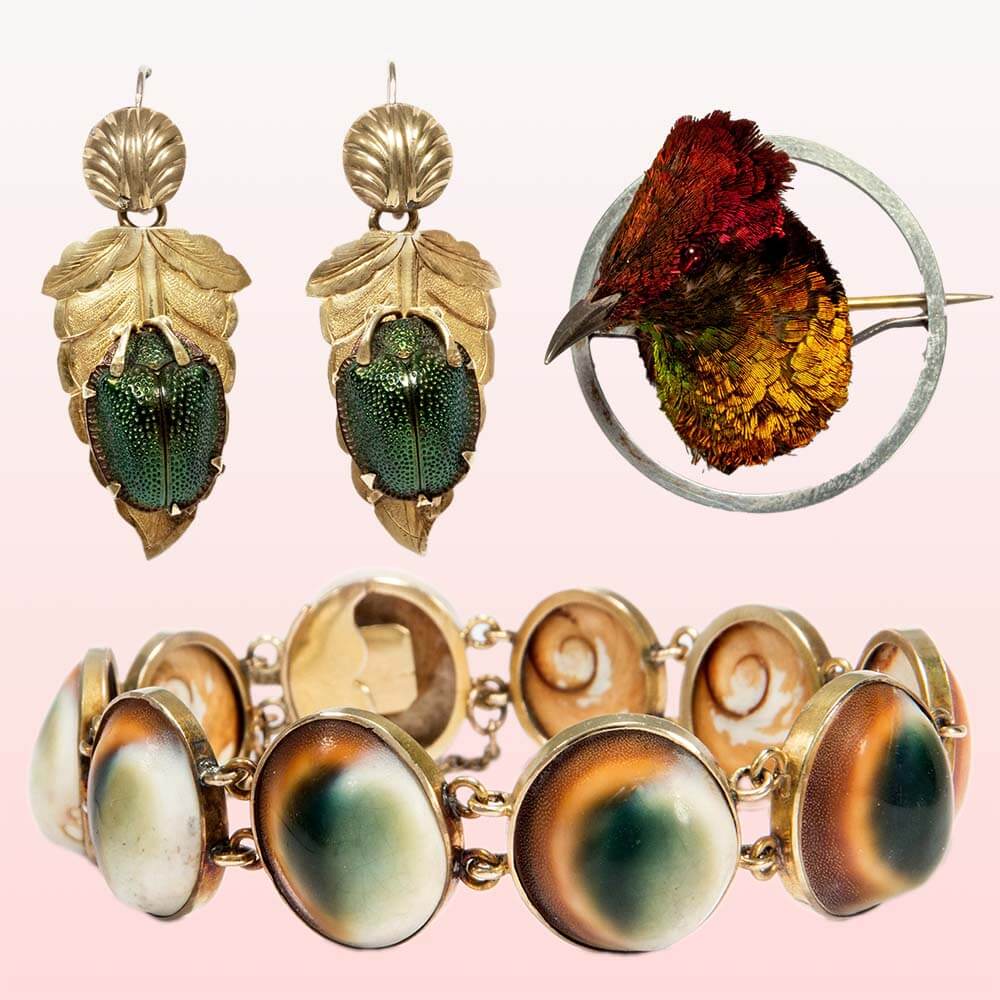 Изумрудно-зелёные жуки, хотя и импортировались из Бразилии, продавались как скарабеи в «украшениях Клеопатры» – украшениях в стиле египетского возрождения. Ещё более необычным украшением служила жаберная крышка – «дверца», которой морская улитка закрывает свою раковину. Жаберные крышки служили браслетами-«ривьерами» или ожерельями, утоляя – пусть и ненадолго – жажду новизны.