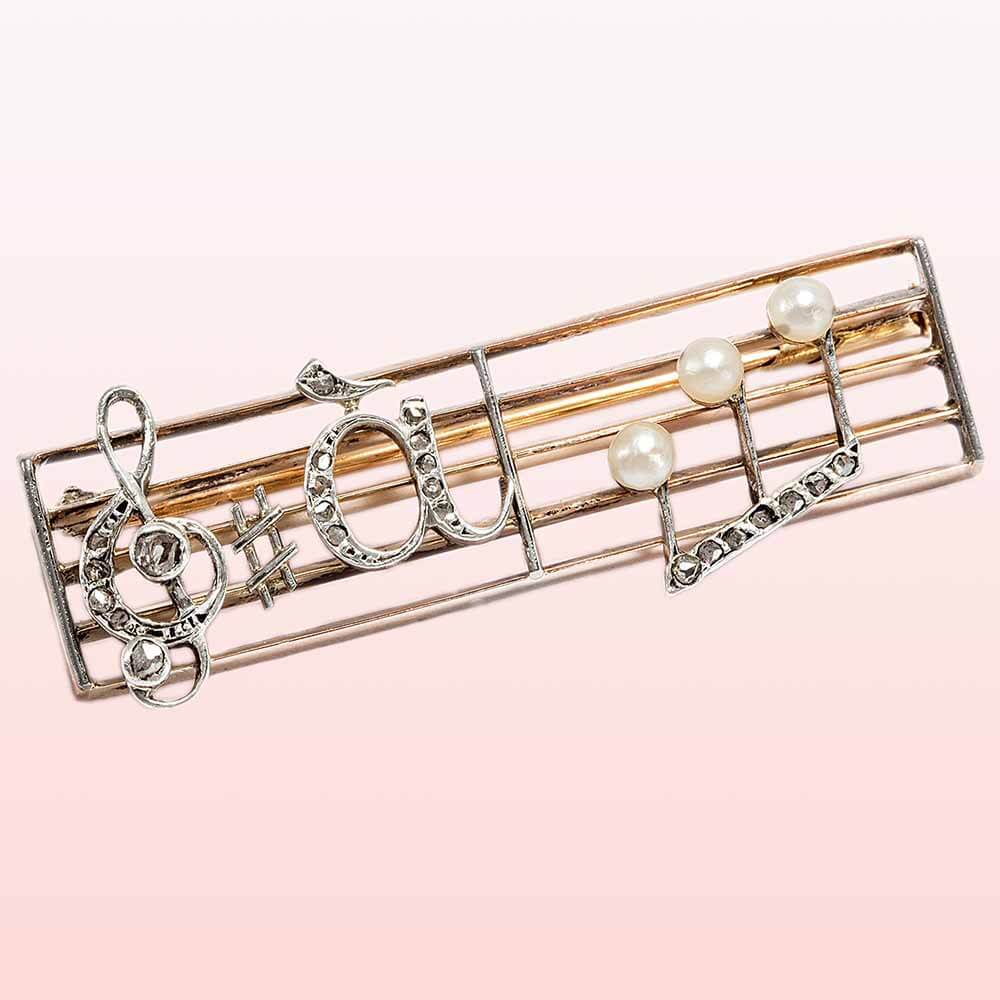 Более причудливые броши, изображающие нотный стан, могут передавать небольшие послания с помощью музыкальных нот, которые, если их разгадать, складываются в фразу «à l'adorée» (моей любимой – à, ля, до, ре) или «Дорогой» (ре, ми, ля, пауза).