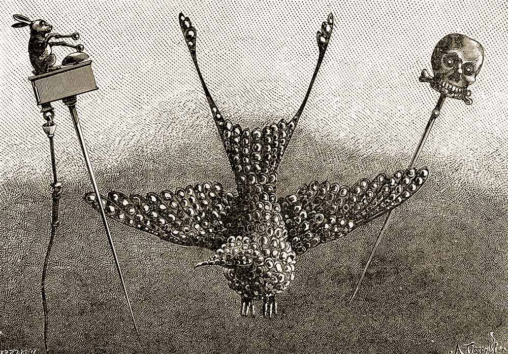 Безусловно, самым культовым из этих украшений является булавка для галстука в форме черепа, впервые представленная на Парижской выставке 1867 года. Работая от скрытой батарейки, она могла вращать глазами и щёлкать челюстью.