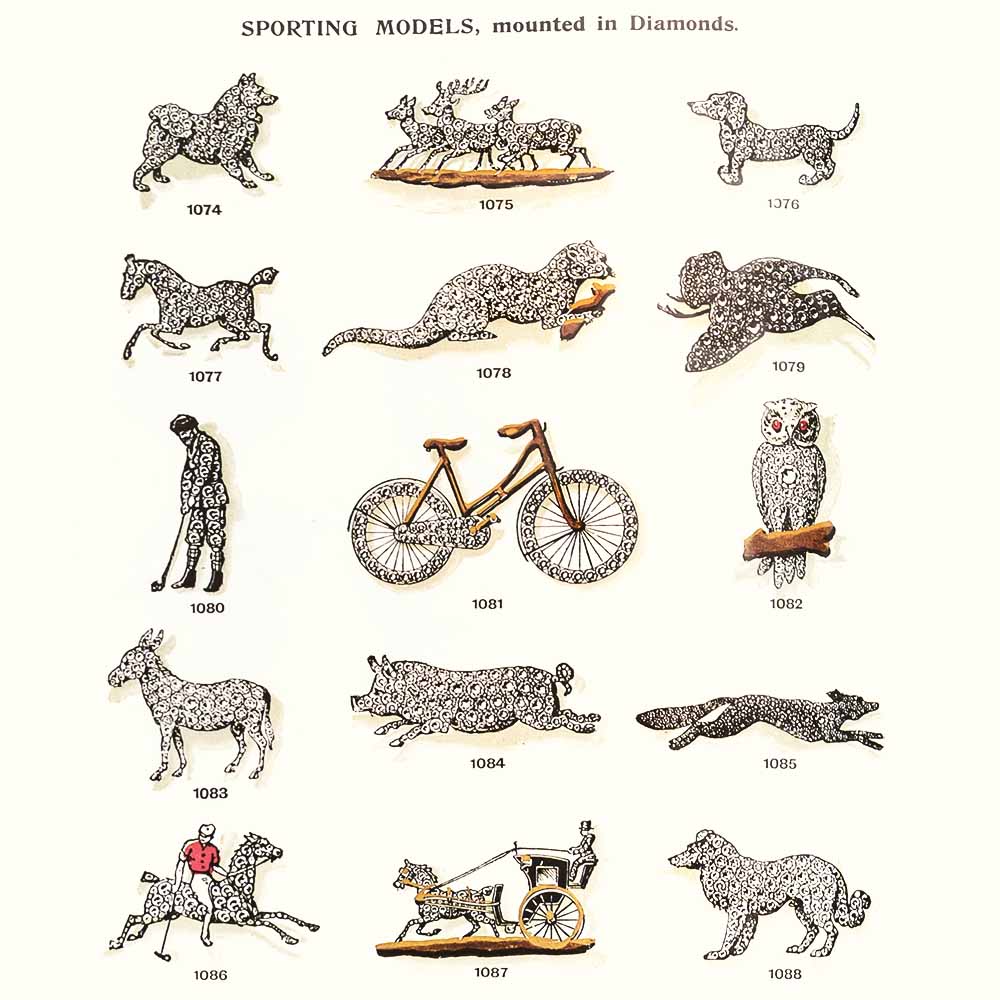Страница с бриллиантовыми брошами на спортивную тематику, Стритер (Лондон), около 1898 г.
