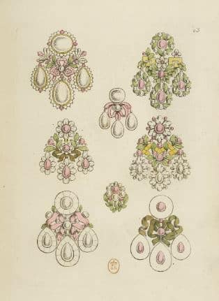 Жан-Анри Проспер Пуже, ювелир и орнаменталист, в 1762 году оставил нам в своем «Трактате о драгоценных камнях и способах использования их в украшениях» прекрасные иллюстрации с изображением гуашей, изображающих жирандоли: